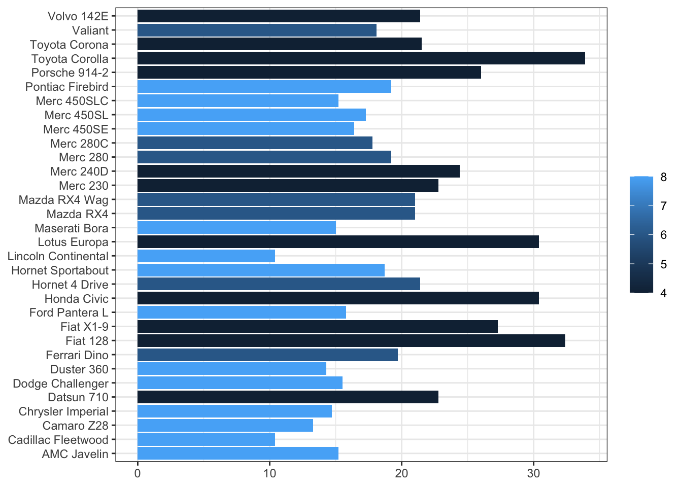 Notice also that I’m using rownames(mtcars) in the aesthetic mapping. The mtcars dataset stores car names as row names rather than as a column, which is a somewhat unique structure. The function handles this without issue—it just passes the expression through to ggplot, which evaluates it in the context of the data. This flexibility means I can still do data transformations on the fly without preprocessing my data frame.