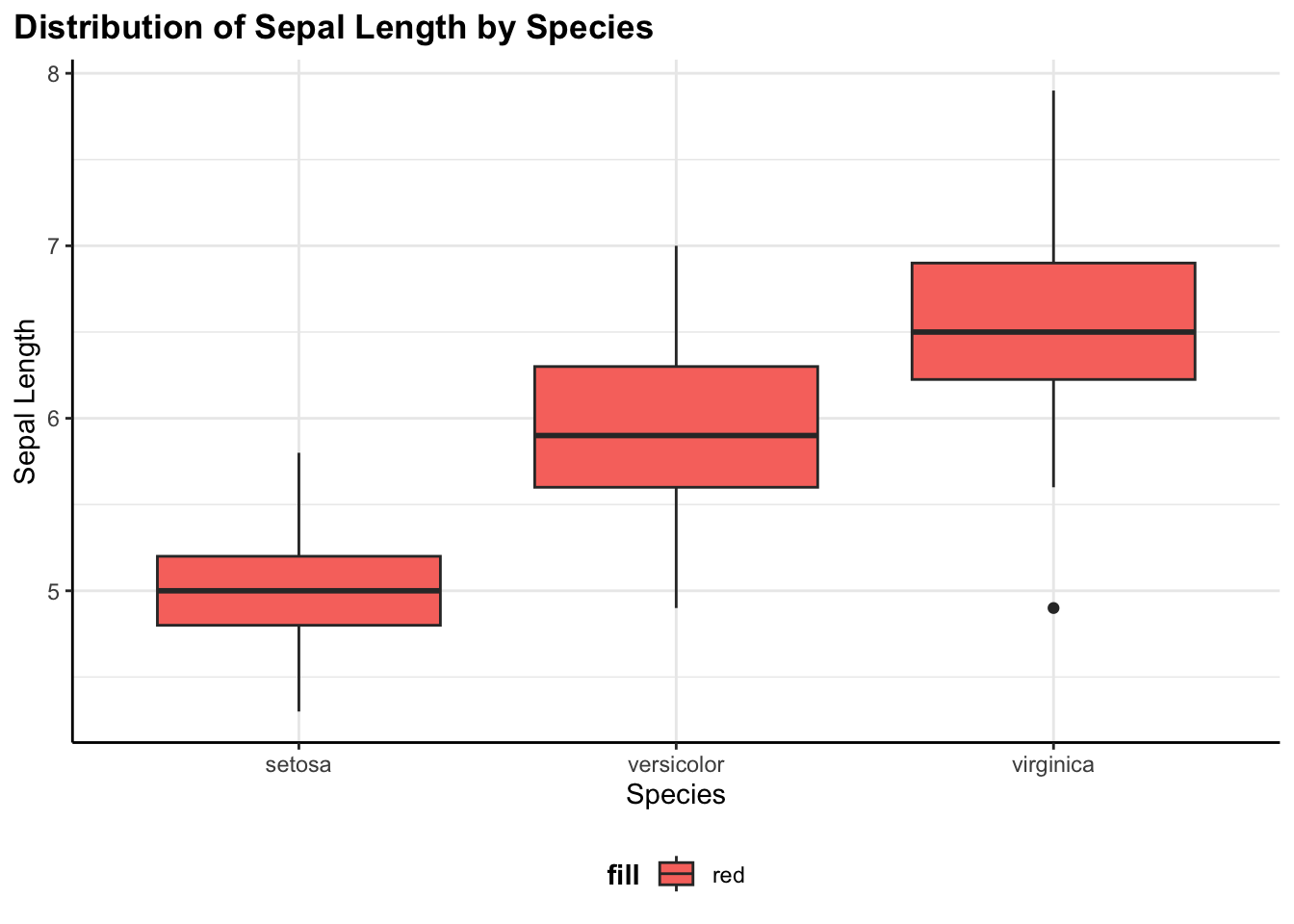 This shows the distribution of sepal length across the three iris species. Boxplots are great for comparing distributions and spotting outliers.