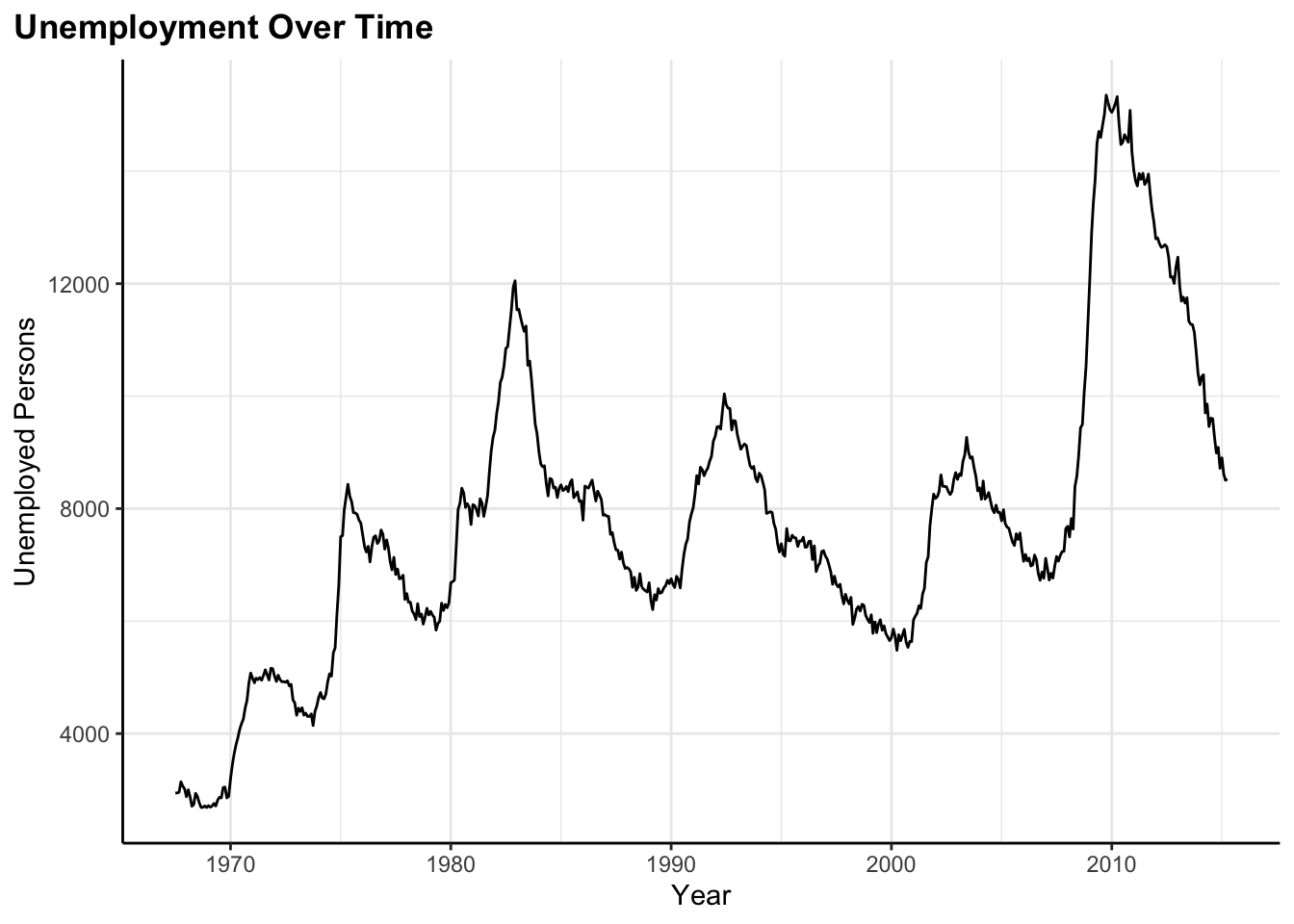 Here I’m tracking unemployment over time using the built-in economics dataset. Line charts are perfect for time series data where I want to see trends and patterns over time.