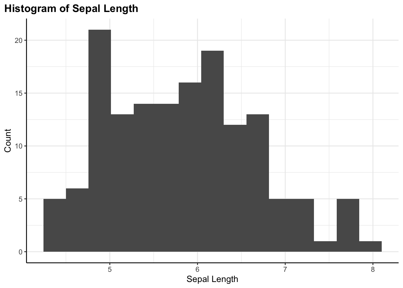 A histogram showing the distribution of a single continuous variable. Notice the bins = 15 parameter—this is being passed through the ... argument directly to geom_histogram().