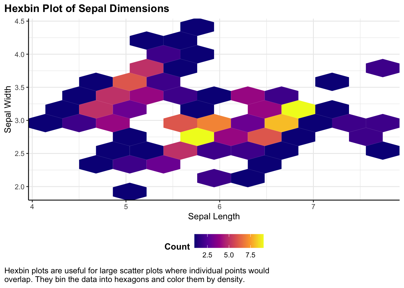 caption = "Hexbin plots are useful for large scatter plots where individual points would overlap. They bin the data into hexagons and color them by density.",